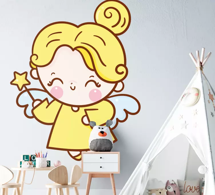 Transform your child's space with our stunning Wall sticker for kids cute angel design. This delightful design features a whimsical angel character with a smiling face, complete with a wand and a playful aura. The yellow hues and fairy-like charm create a child-friendly atmosphere, making it perfect for any nursery or playroom. Your little one will adore this charming addition that sparks imagination and joy!