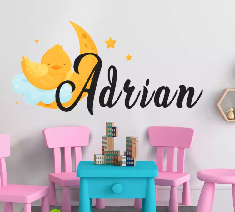 Transform your little one's space with our enchanting Wall sticker for kids cute moon design. This delightful illustration features a charming moon, a sleepy chick, clouds, and twinkling stars, creating a serene atmosphere perfect for any kids room. With the option to add a custom name, this personalizable decor piece is designed to make bedtime magical and memorable for your baby.