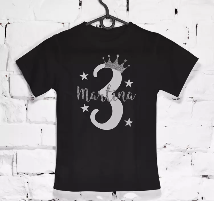 Reference: T5283This stylish outfit features a charming black design with a sparkling crown and the number three. Personalization includes the name 'Martina,' making it perfect for birthday celebrations. It's a delightful choice for any little one celebrating their special day.