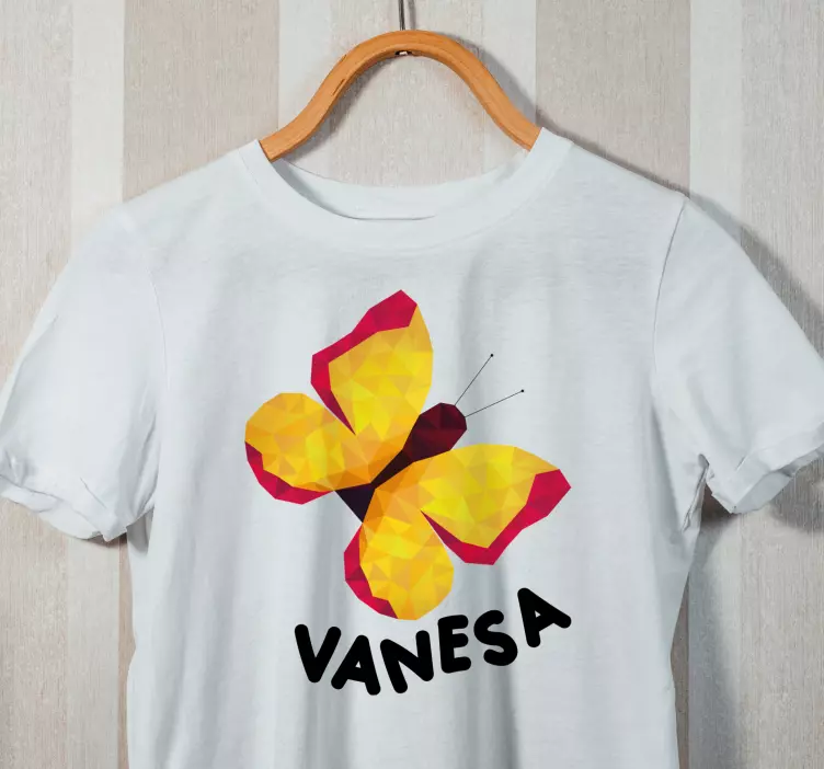 Introducing our Baby t-shirt with colorful butterfly design, a delightful piece adorned with a vibrant hand-drawn butterfly that captures the essence of fun! This stunning design features a polygonal, flying insect that combines cheerful yellow and red hues, making it a perfect addition to your child's wardrobe. Plus, you can personalize it with a custom name to add a special touch!