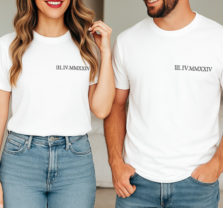 Reference: T5498Introducing our stunning Couple t-shirts with matching roman numerals, designed to celebrate love in a unique way! Each shirt features a beautiful graphic showcasing elegant roman numerals that symbolize your special date together. Crafted from a soft blend of 85% cotton and 15% viscose, these t-shirts are not only stylish but also incredibly comfortable. With a classic round neck and short sleeves, they are perfect for any casual outing. Available in timeless black and white, these shirts are a must-have for every couple!