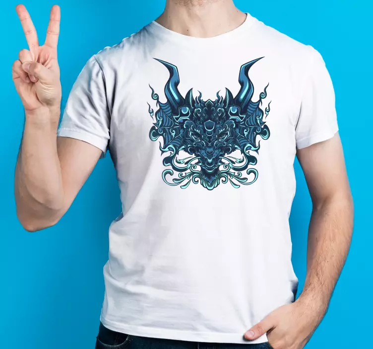 The Fierce horned creature t-shirt showcases a stunning graphic design that captures the essence of a mythical and scary dragon. This artistic representation presents a blue creature with terrifying horns and an intense gaze, evoking a sense of horror and fascination. With its bold elements and evil undertones, this icon of Nipponese culture is perfect for those who appreciate the darker side of art!