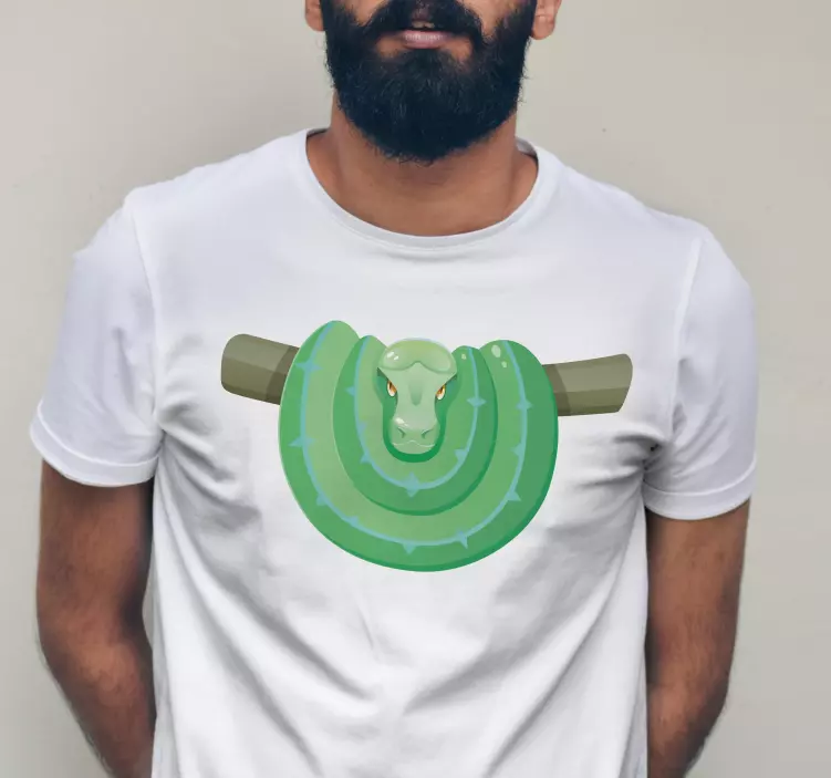 The Green snakelike design t-shirt features a captivating illustration that showcases a vibrant green boa intertwined with a branch, depicted in a playful cartoon style. This stylish and unique design makes it the perfect casual wear for those who want to stand out and express their love for nature!