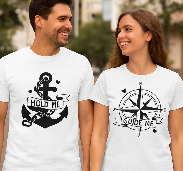 Caring for your Hold me guide me couple t-shirts is simple! Just machine wash them at 30 degrees, and for best results, iron them inside out or with a barrier cloth to protect the design. Enjoy your shirts for many moments to come!