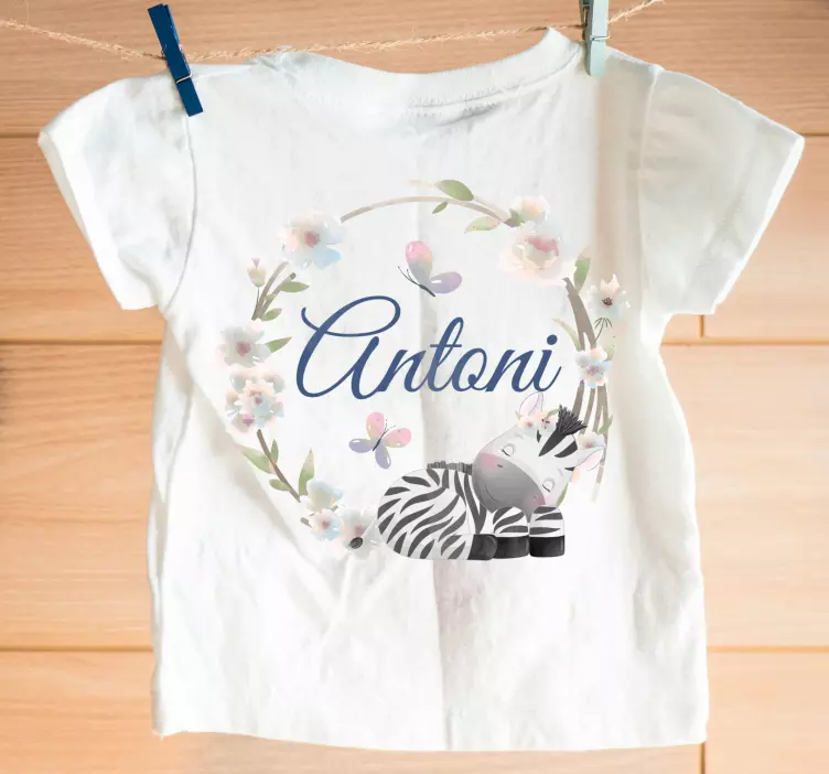 Introducing our adorable Personalized zebra nursery baby t-shirt, featuring a whimsical design that showcases a sweet zebra sleeping surrounded by a floral wreath. This charming watercolour illustration is perfect for any nursery, adding a touch of cuteness to your baby's wardrobe. What makes this piece truly special is its customisable feature, allowing you to personalize it with your little one’s name, making every t-shirt unique and special!