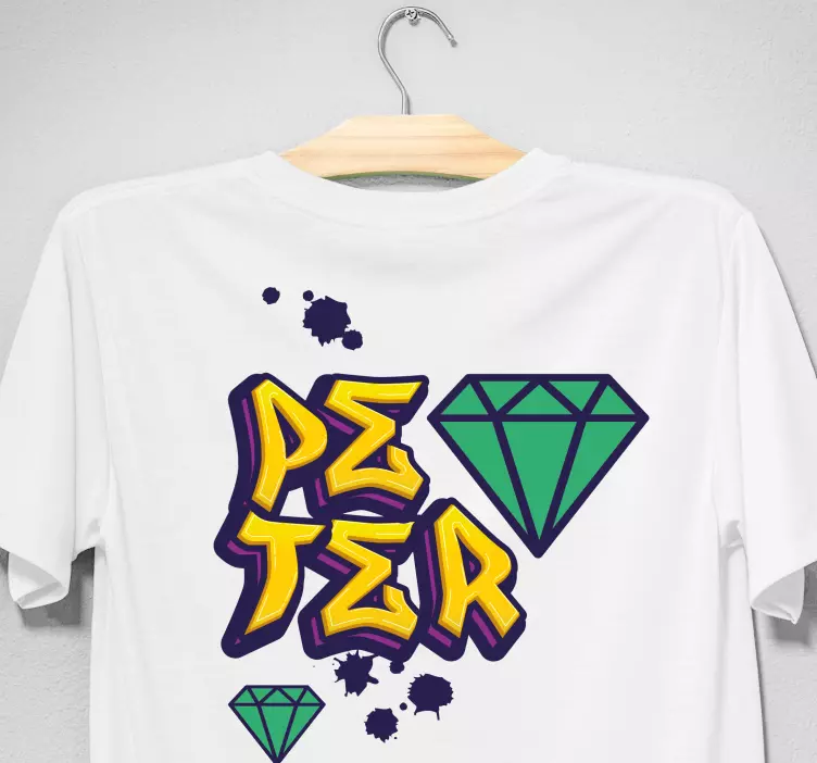 Introducing our stunning T-shirt with name peter diamond design, a vibrant piece that captures the essence of graffiti and street art! This urban art-inspired t-shirt features a colorful diamond design that brilliantly pops against the fabric, making it a playful addition to your wardrobe. Crafted with a perfect blend of 85% cotton and 15% viscose, this custom and customisable shirt is designed for those who appreciate fun and creativity in their fashion. Whether you’re hitting the streets or just hanging out, this graffitti design is sure to turn heads!
