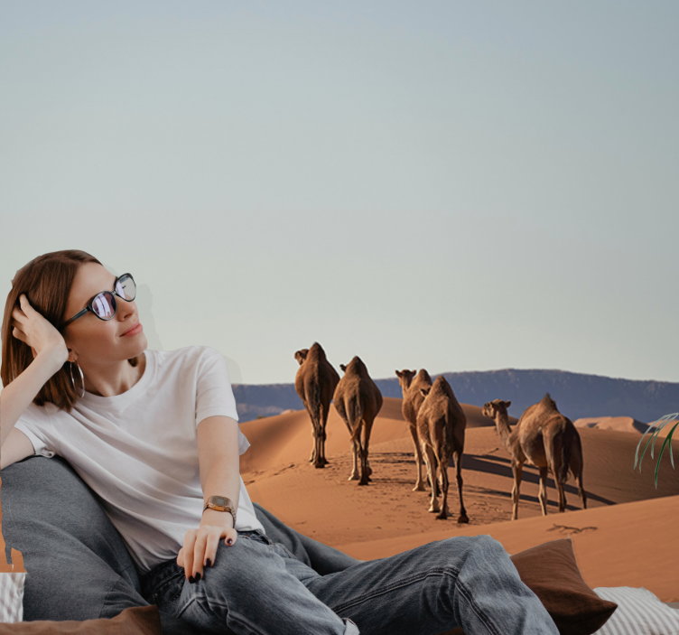 Transform your living space with our stunning Desert wall mural desert camels, a captivating design that beautifully captures the essence of the serene desert landscape. Featuring graceful camels traversing golden dunes, this mural brings the essence of nature right into your home. The rich hues of sand and the majestic animals create a tranquil ambiance that invites relaxation and inspiration!