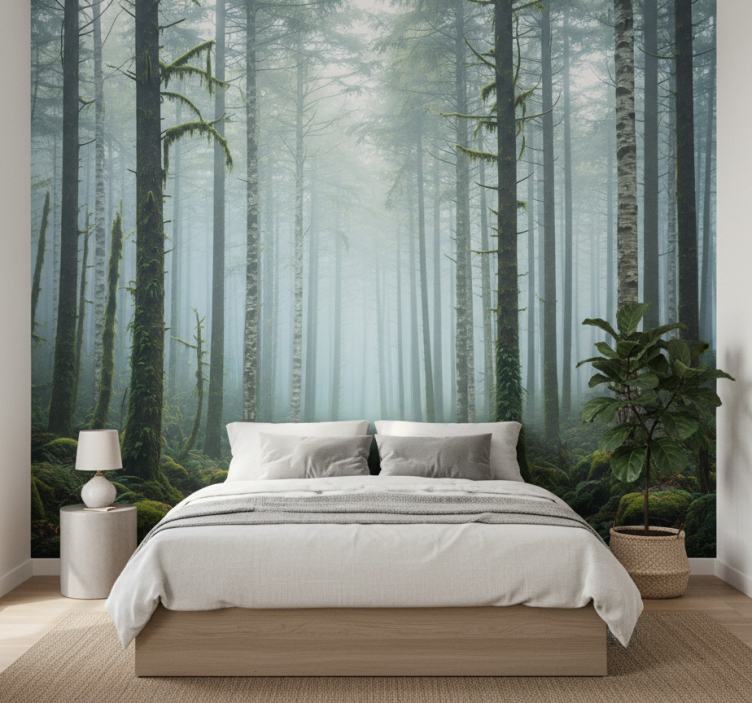 Forest wall mural atmospheric mist design