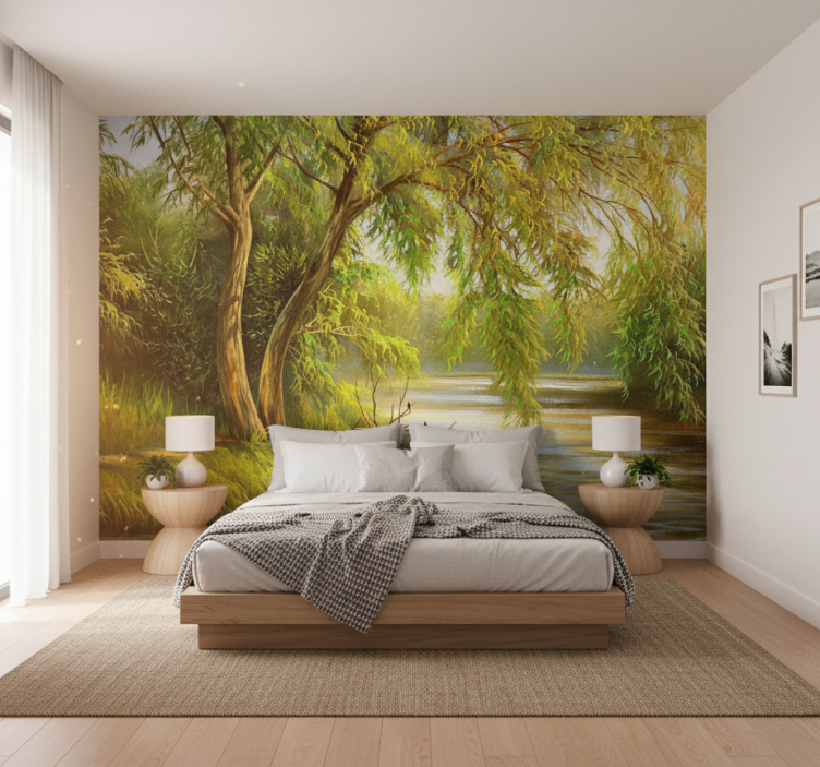 Enhance your home with the captivating Forest wall mural serene river willow forest wall mural. This mural inspires a sense of calm and tranquility, inviting the beauty of nature indoors. Perfect for living rooms, bedrooms, or meditation spaces, it creates a peaceful retreat that encourages relaxation and reflection. Immerse yourself in the serene ambiance it offers!