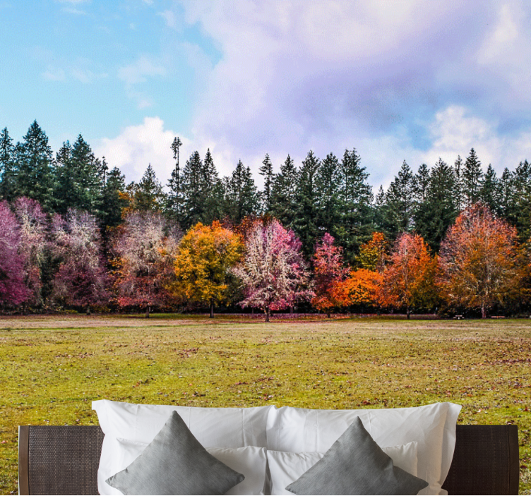Transform your space with the stunning Nature wall mural colorful autumn forest. This captivating design showcases a beautiful landscape filled with vibrant trees and fields, enveloping you in the rich hues of autumn. The photography captures the essence of a serene forest, making it a perfect addition to any room that craves a touch of natural beauty!