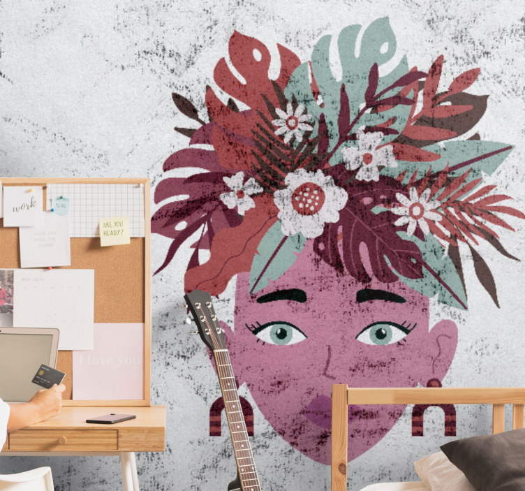 Transform your space with our stunning People wall mural stylized floral head, featuring an exquisite graphical design that beautifully combines the face of a woman adorned with vibrant flowers and lush tropical leaves. This portrait showcases intricate textures that elevate any room, making it a perfect centerpiece for your decor.
