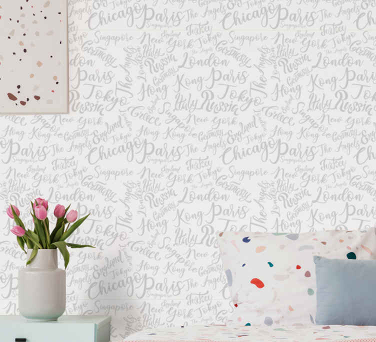 If you're a travel enthusiast, then you'll definitely love our graffiti-style wallpaper featuring the names of different cities and countries. This unique wallpaper design has a white background that adds a touch of elegance to any space.